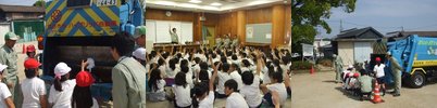 6限目はパッカー車を見学しました。クラスの代表の子が実際にパッカー車に付いているボタンを操作してゴミの回収作業を行いました。