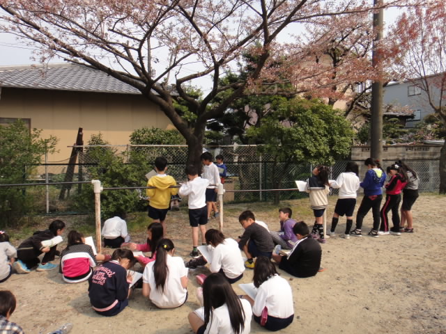平常授業がスタートしました。写真は、理科の学習「春の自然」です。桜など学校にある春を探して観察していきます。