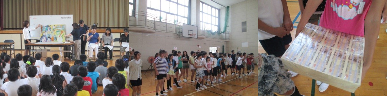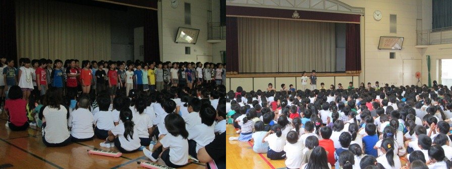 7月2日(水)5限目に学校集会が行われました。6年生はみなさんに紹介したい詩ということで、「早口言葉のうた」と「はきものをそろえる」の2つの詩の朗読をしました。はきものをそろえることは最高学年になった4月から取り組んできていることです。全校の前で朗読することで、自分を見直すきっかけとなりました。「早口言葉のうた」では、代表が前に出て、「交響曲・歌曲・協奏曲」などの早口言葉に挑戦しました。会場からは歓声と拍手が沸き起こりました。その他、委員会の代表の話、鑑賞する態度など、どれも6年生としてふさわしい態度で臨めたと思います。 |