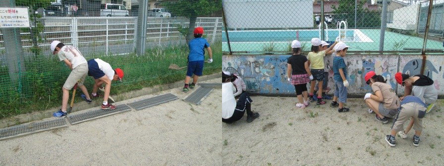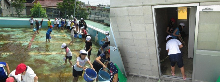 5.6限目にプール掃除を行いました。1年近く使用していないプールには藻がはって真っ黒、まるで海のような匂いがしていました。みんなで協力して泥や藻をこすり落としたり、草を抜いたり、更衣室やトイレもきれいにしました。プール開きが待ち遠しいですね。ご苦労様でした。