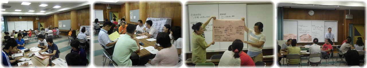 今日も1日研修会を行いました。午前中の前半は,全員が書いた学級集団づくりに関するレポートをもとに1学期の取組を振り返りました。講師の人権プラザ天白指導主事からは学級集団づくりで大切にしていくポイント等の助言をいただきました。(1枚目)午前中の後半は,7月24日に引き続き四日市人権同和教育研究大会に提案するレポートの検討会を行いました。提案当日を想定して,全員で質問や意見等を出し合いました。(2枚目)午後は全国学力・学習状況調査の問題を事前に全員で解き,そこから授業で子どもたちにどんな力をつけていくべきかということについて話し合いました。グループで話し合い,模造紙にまとめて発表しました。今回の研修を2学期の授業づくりに活かしていきたいと思います。(3・4枚目) |