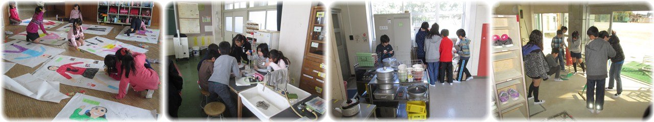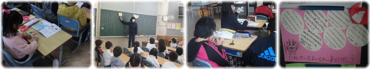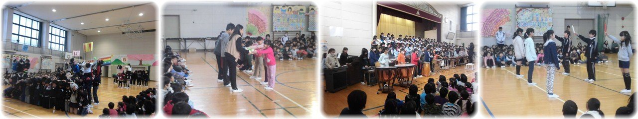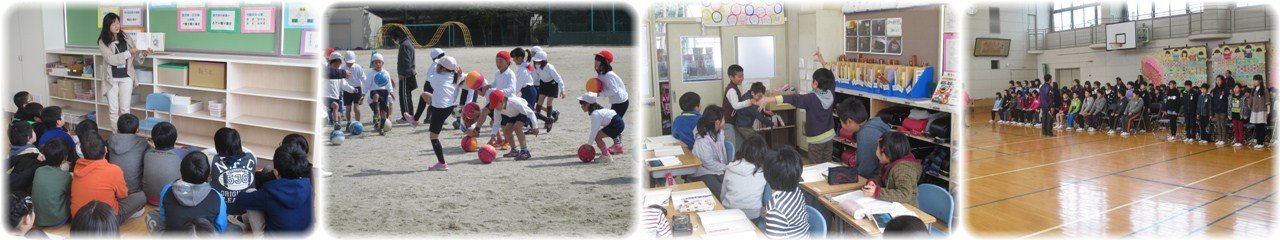 ☆マジョリカの皆さんが,6年生に読み聞かせをしてくださいました。6年生にとっては小学校生活最後の読み聞かせ。絵本をじっとになりました。また,☆マジョリカの皆さん,1年間,ありがとうございました。(1枚目)1年生の体育。今日は,サッカー。全員がボールを1つずつ使って,頭や胸に乗せたりバウンドさせたりしました。2人でボールを取り合う遊びや,円の外から中心に置かれたコーンにボールをけって当てる遊びもしました。たっぷりサッカーボールに親しんだ1時間でした。(2枚目)3年生が,国語の物語『モチモチの木』を学習していました。3人の子どもが豆太,じさま,モチモチの木の様子を演じると,「豆太は怖いんだから笑っちゃダメ」「モチモチの木は,止まっていないでもっとワサワサ動かないと」などと子どもたちから注文が付けられました。演者が交代してもう一度演じました。こうして,怖くてせっちんに行けない豆太とそれを見守るじさまの気持ちや様子をみんなで読み取っていきました。(3枚目)6年生は,いよいよ今日から卒業式の学年練習に取り組み始めました。在校生代表として参列した昨年のことを思い出しながら姿勢や動作を確かめた後,返事の練習をしました。全員がそろって返事をすると,歯切れがよく大きな『はい』という声が体育館に響き渡りました。一人ひとりが練習する場面では,指導者の呼びかけに返事を返すその表情に,「今年は主役。しっかり堂々とやるぞ」というやる気と決意が感じられました。(4枚目) |