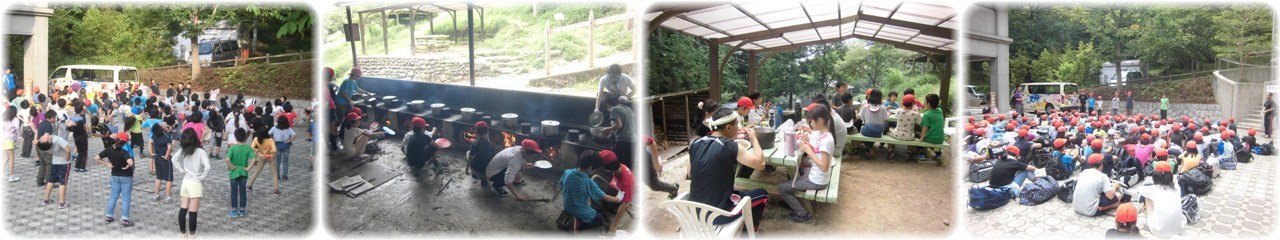 2日目の朝を迎えました。朝のつどいに集まった子どもたちの顔は少し眠そうでしたが,みんなで体操をして体と頭をリフレッシュしました。(1枚目)朝食を食べた後は部屋の掃除などを行い,野外炊事の準備にかかりました。飯ごうでご飯を炊き,カレーライスを作りますが,薪に火をつけるのに一苦労でした。やっと火がつき,悪戦苦闘しながらも何とか食事にたどりつきました。野外炊事の大変さが身にしみて感じたのではないでしょうか。(2枚目)結果的にはどの班もおいしくでき上がり,「おいしい!!」とニコニコ顔で食べていたのが印象的でした。(3枚目)片づけを済ませ,退所式をして,いよいよ少年自然の家とのお別れです。(4枚目)重い荷物の中に楽しい思い出をいっぱいつめた子どもたちはバスに乗って学校に向かいました。