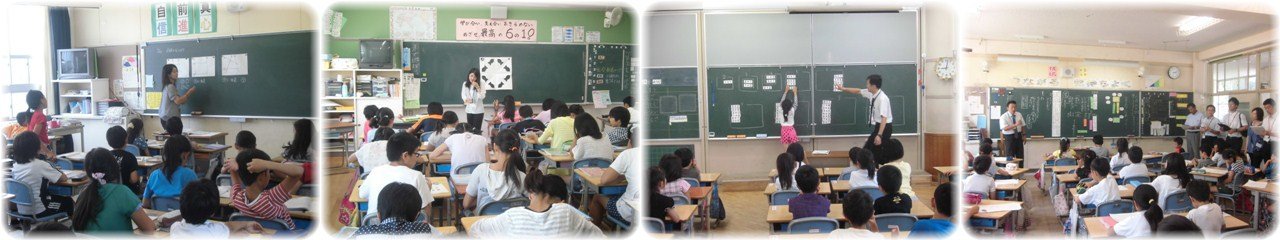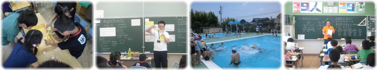 2年生の算数科は「水のかさをはかろう」という学習に入りました。2種類のペットボトルに入った水のかさのどちらが多いかを比べる方法を考えます。班で分担しながら実際にコップを使ってペットボトルの水のかさを量ります。そこには仕掛けがあって大きさの違うコップが2種類混ぜてあったのです。結果が班によって違ってきたところで,みんなで同じ大きさのコップで量ることの必要性を確認しました。(1・2枚目)3年生の水泳です。今日は学年でプールに入り,いつもより人数が多かったので,高学年用プールの浅い部分も使って練習しました。プールの横の長さを使って,端から端までふし浮きやバタ足等で一生懸命泳ぎました。(3枚目)6年生の算数科です。線対称な形の復習から授業が始まりました。方眼がある場合とない場合の両方のパターンで線対称な図形を書く練習をしました。次に点対称について学習しました。アルファベットカードを使って180°回転させたときにぴったり重なる図形であることを確認した後,アルファベット26文字の中から点対称な図形を見つけ出す活動を行いました。(4枚目)