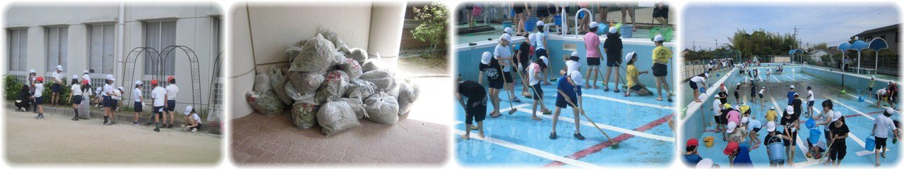 1限目に「学校環境デー」の取組として,全校で草取り・石拾い・溝掃除等を行いました。学年ごとに分担された場所の草を一生懸命取っている姿や溝の砂をすくって一輪車に何度も入れている姿が見られました。終了が近づくと抜いた草を入れたごみ袋がピロティに山のように積まれました。子どもたちのがんばりのおかげで,学校周りがきれいになりました。(1・2枚目)6年生が16日のプール開きに向けて5・6限目にプール掃除を行いました。はじめは泥だらけだったプールもみんなで力を合わせて一生懸命掃除をしてくれたおかげで,徐々に水色のプールの底が見え始め,見違えるほどきれいになっていきました。プールサイドや通路,更衣室等もきれいに掃除してくれました。これで今年も気持ち良く水泳学習に取り組めます。(3・4枚目)