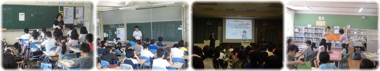 3年生の書写です。3年生から毛筆が始まり,今日は横画「一と二」の練習を行いました。はじめに手本をなぞり,いよいよ手本を見て自分で書きます。始筆の部分では指導者から「折り紙を斜めに折った形になるように」という具体的な指導があり,子どもたちは意識しながら筆を入れていました。(1枚目)5年生の国語科で「敬語名人を目指そう」という学習に取り組みました。敬語には3種類あることやそれぞれの違いについて説明があった後,ワークシートを使って実際に文章を敬語に直す練習を行いました。時と場に応じて敬語が使えるようになるといいと思います。(2枚目)NTTドコモの職員を講師にお招きし,6年生が「ケータイ安全教室」を行いました。インターネットとの正しい付き合い方や携帯電話・スマートフォンを使う時のルール等をていねいに教えていただきました。ルールやマナーを守って正しく使うことの大切さを学びました。ぜひご家庭でも話題にしてほしいと思います。(3枚目)6限目は委員会活動でした。これまでの活動を振り返る委員会やこれからの活動のための準備に取りかかる委員会がありました。図書室では,明日から始まる読書週間の取組のための準備作業を行っていました。(4枚目)