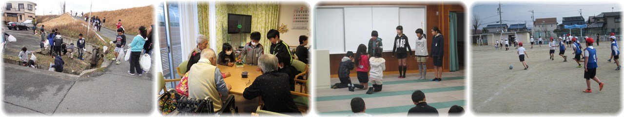 4年生が総合的な学習で,誰もが住みやすい地域にするために自分たちでできることをしに町に出かけました。公園や側溝の清掃に出かけたグループは,思っていた以上にごみが多いことに驚いていました。植込みの下,草むらの中,拾っても拾ってもあちらこちらからごみが出てきました。でも,通りかかった地域の方から「ありがとう」「ごくろうさん」「がんばってるね」などと声をかけてもらえたことがとてもうれしくてやる気が出たそうです。学校に戻ってからも,ごみの分別や水洗いの作業が続きました。地域の高齢者の方との交流に出かけたグループは,かるたやお手玉などで遊んだり紙芝居を披露したりして,とても楽しい時間を過ごしました。高齢者の方々も,子どたちとのふれあいをとても喜んでくださいました。お互いに,「また来てね」「また来たいね」と言い合って別れました。(1,2枚目)6年生は,外国語活動のまとめとして「オリジナルMomotaro」の劇発表に取り組みました。おとぎ話の桃太郎をアレンジしたシナリオを考えてきました。もちろんセリフは英語です。「Let's go to ONIGASHIMA!」「Can't you give me a KIBIDANGO?」など,これまでに学習してきたフレーズがたくさん使われてしっかりとしたストーリーに仕上がっていました。笑える場面も随所にある,楽しい劇でした。子どもたちは少し照れながらも,なかなかきれいな発音で役を演じていました。(3枚目)今年度最後のクラブ活動。1年間に8回,スポーツや調理,ゲームなどの活動に取り組んできました。楽しいだけでなく,学年を超えた子どもたちが集まって活動する,子どもたちにとって大切な時間でもありました。(4枚目)