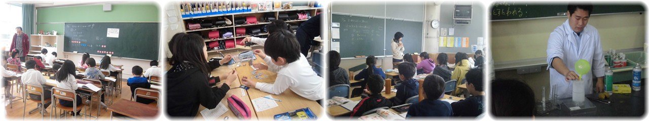 1年生の算数科は重点単元「ずをつかってかんがえよう」に入りました。クラスを2つに分けて少人数で学習します。「5人が一輪車に乗っていて,あと3台あまっている場合,一輪車は全部で何台あるか」といった問題を図を使いながらこれまでに学習したたし算やひき算で解いていきます。「5人が一輪車に乗っている→一輪車が5台ある」という置き換えを図を使って考え,式に表していました。(1枚目)3年生の算数科は「重さ」について学習しています。ものさし,コップ,クリップ,ひもを使って手作りてんびんを作り,消しゴムやえんぴつキャップ等の重さが1円玉何枚分とつり合うかを調べていました。(2枚目)5年生の算数科は「立体」の学習に入りました。いくつかの立体を角柱と円柱の2つのなかまに分ける活動を行っていました。これから角柱と円柱のそれぞれの特徴について詳しく調べていきます。(3枚目)6年生の理科ですが,いつもと様子が違います。今日は「学びの一体化」の取組として,南中学校の理科の先生に出前授業をしていただきました。テーマは「液体窒素で−200℃の世界を体験しよう」です。花,新聞紙を液体窒素の中に入れるとどうなるかを予想し,いざ実験してみると花は凍ってパリパリになり,新聞紙はそのままという結果になりました。続いてゴムやソフトテニスボールでも同様に実験しました。最後に二酸化炭素と酸素を風船に閉じ込めて試験管に取り付けて液体窒素の中に入れると,二酸化炭素は固体になり酸素は液体になりました。固体となった二酸化炭素はドライアイスであること,酸素の中では物が激しく燃えることを確認してあっという間に時間が経ってしまいました。小学校ではなかなか出会えない珍しい実験を見ることができ,子どもたちは「とても楽しかった」という感想を書いていました。(4枚目)