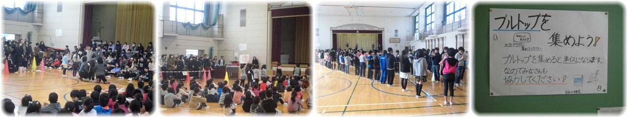 27日(金)に行われる「6年生を送る会」を控えて,今日は学年練習を保護者の方々に公開しました。約180名の保護者に見ていただき,ありがとうございました。今年度初めての試みでしたが,いかがだったでしょうか。各学年ではリハーサルを行ったり,パート練習を行ったりして27日の本番に向けて気合いが入った練習となりました。きっとすばらしい「6年生を送る会」になることでしょう。(1〜3枚目)4年生が「総合」の学習で「だれもが住みやすくなる町」をめざした取組を行ってきて,その一環としてポスターを作って日永小の子どもや町の人に呼びかける活動を始めました。学校の掲示板にはプルトップ集めを呼びかけるポスターが貼られていました。(4枚目)