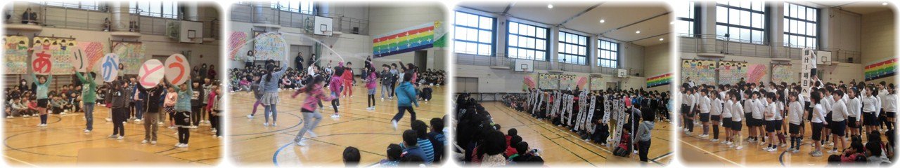 トップバッターは1年生の「6年ウォッチッチ〜ありがとうの旅〜」です。奪われた「あ・り・が・と・う」の5枚のメダルを奪い返すために1年生が6年生にクイズを出したり,エアー縄跳びをしたり,かわいくダンスを踊ったりする姿を見て思わずにっこりの6年生でした。(1枚目)2年生は「3枚のおふだ」です。九九に合わせて踊る「九九ダンス」,リズミカルな「クラッピング」,難しい技に挑戦した「長なわ」という3枚の伝説のおふだに示された技を見事に披露しました。最後に「あったかいんだからぁ」の歌の2番を替え歌にして感謝の気持ちを伝えました。(2枚目)3年生は「今日からはじまる・ソラシドマーチ」です。初めに「今日からはじまる」という詩を書いた短冊を示しながら全員で暗唱しました。そして「ソラシドマーチ」という曲をリコーダーで演奏した後,合唱しました。(3枚目)3年生の演技の後は5年生が企画したブレイクタイムです。日永小学校にちなんだクイズが出題され,答えを考えている間にダンスを踊るというパフォーマンスがありました。ブレイクタイム後の4年生は「Tomorrow〜こんな6年生になりたい」です。運動会の応援合戦や組立体操(ダンス・表現)の一場面を再現したり,短なわや長なわの技に挑戦したりして6年生へのあこがれを示しました。最後に「Tomorrow」の曲に合わせ,歌と振付で「輝け!明日へ」という4年生の思いを6年生に伝えました。(4枚目)