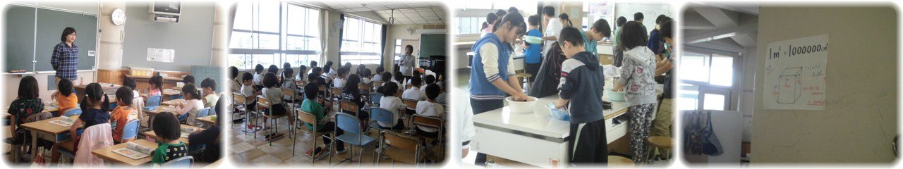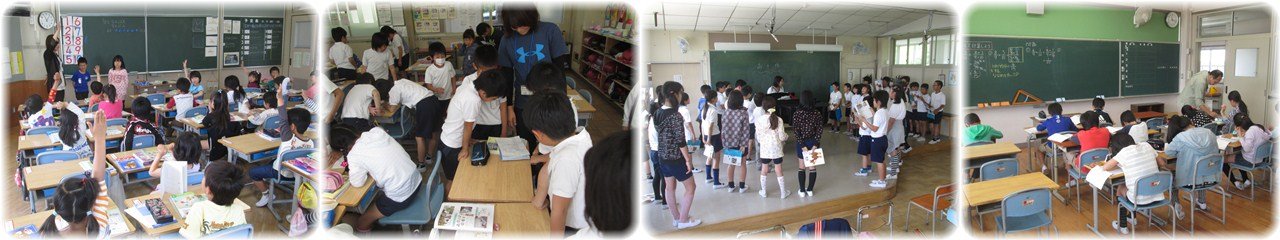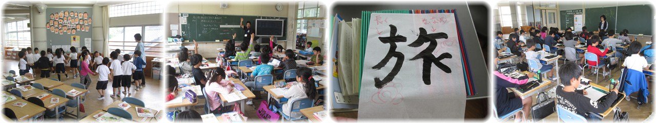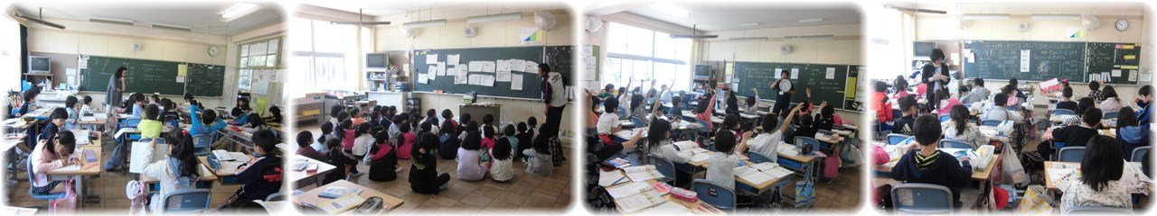 1年生が算数で「○○から○ばんめ」の学習をしていました。指導者に指名された子どもが前に出て、みんなでその子どもが「前(後ろ、右、左)」から何番目の席か答えます。子どもたちは、示された場所から何番目か、机を数えて発表していました。「○番目です」と発表すると、みんなから「同じです!」と大きな反応が返っていました。(1枚目)3年生が社会で、学校から自分の家までの地図をかいていました。友達と、かいた地図を見合いっこすることで、見やすい地図にはみんなが知っているものがかかれていたり、目印があったりすることなどを発見しました。(2枚目)5年生の音楽。『ビリーブ』の合唱に取り組んでいました。練習の合間に指導者から「高音と低温が対決するんじゃないよ。高音と低音をたし算しようよ」とアドバイスがありました。すると、人数の多い高音パートから低音パートに移る子どもが何人かありました。音のバランスを自分たちで考え、動き出したのです。自分の声と全体のハーモニーを感じながら1つの合唱を創り上げていくのですね。(3枚目)6年生の算数、分数の掛け算の学習は、学級を2つのグループに分かれて行う少人数授業です。事前に受けた復習テストの点数を手掛かりに、子どもが『ゆっくりコース』と『どんどんコース』、どちらのコースで学習するかを選びました。自分に合ったペースや内容で学習を進め、力をつけてほしいものです。(4枚目) |