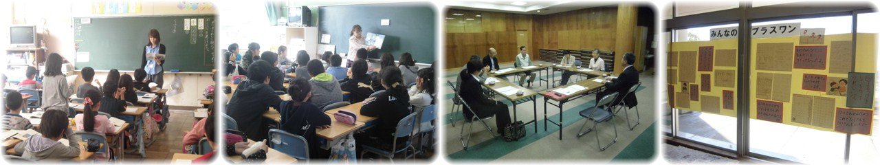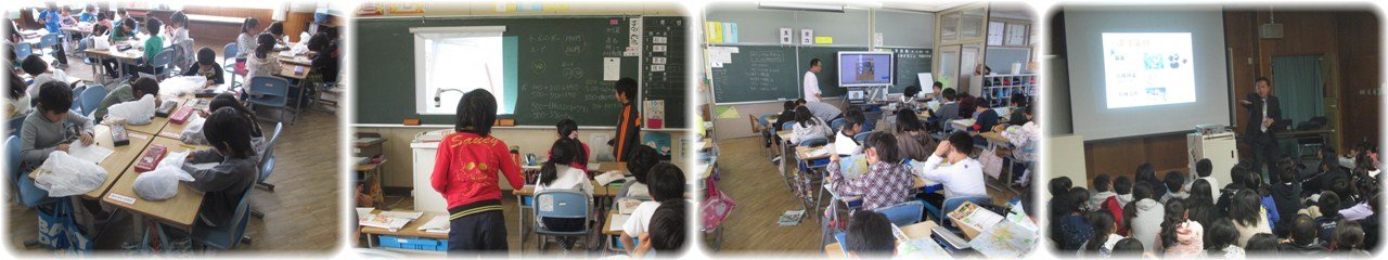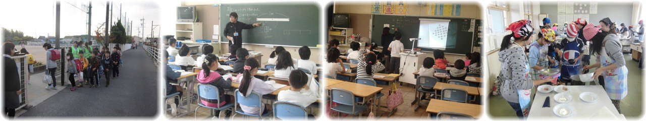 急に冷え込みが強くなった今朝は,PTAの方々も参加していただき登校指導とあいさつ運動を行いました。職員も地域に出かけて行いました。休み明けでしたが,子どもたちからは寒さに負けない元気なあいさつが返ってきて,いいスタートが切れました。(1枚目)3年生の算数で,「分数」に取り組んでいます。「1mを3等分した一つ分を1/3mと表す」とこれまで学習してきたことをもとに,2つ分をどう表すかということについて考えていました。(2枚目)4年生の算数です。ドットが並んだ図形をもとに,そのドットの数を一つの式に表して求めるという学習を行っていました。ドットを移動させたり,一つのかたまりと見たりすることによって,かけ算やたし算を組み合わせると簡単に計算できることを発見していました。黒板の前で書画カメラを使って考え方を説明すると「なるほど!」という声が聞こえました。(3枚目)6年生が家庭科の調理実習で「野菜のベーコン巻き焼きと粉ふきいも」に取り組んでいました。ベーコンでアスパラガスとニンジンを巻き,楊枝で止めてフライパンで焼くと,いいにおいが家庭室に立ち込めました。隣の鍋の中にはジャガイモを茹でていました。(4枚目) |