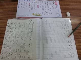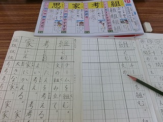 ②スキルノートのよこに見本プリントをおきましょう。その上に漢字ドリルをおいて,見本と同じようにスキルノートに書いていきます。下じきをわすれずに!