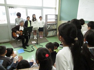三泗音楽会で4年生が歌った「いのちのまつり」のもとになった絵本の読み聞かせと、「いのちのまつり」の歌の合唱にチャレンジです。