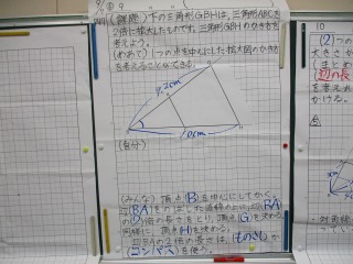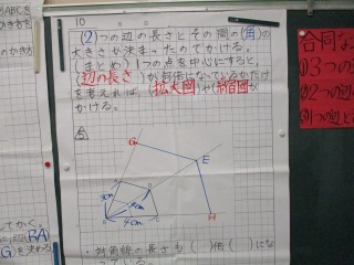 また、3限目はこれから復習もするということを前置きしてから、「拡大図と縮図」の単元の授業を行いました。こちらも、写真をご覧ください。