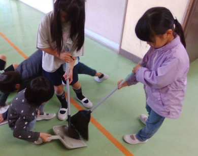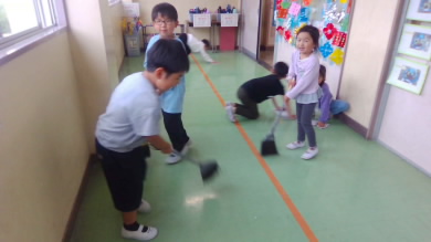ぞうきんの人も、後ろから拭いていって、仕上げます。
