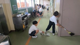 時間内にすっかりきれいになって、配付物を配る5年生。