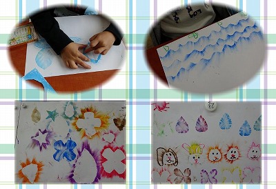 思い思いに画用紙をくり抜いたステンシル型を作り、型の中や、ふちに塗ったクレヨンを指で伸ばして、色を付けていきました。