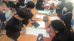 図形に様々な補助線を書き足して、仲間と相談しながら解いています。