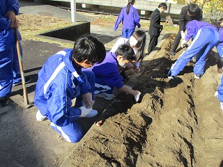 本日の放課後、環境福祉委員のみなさんによってチューリップの球根を花壇に植えてもらいました。楽しそうに作業するみなさんのおかげできれいなチューリップが花壇いっぱいに咲きそうですね。寒い中、お疲れさまでした。