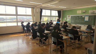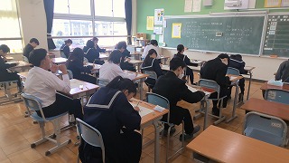 今日から1,2年生は学年末テストが始まりました。1年間の学習の成果を確認できるようにしましょう。3年生は今日、明日と三者懇談があります。いよいよ進路選択も大詰めです。自分の力で将来を切りひらけるよう進んでいきましょう。インフルエンザもまだまだ要注意です。元気に一日を過ごせるよう体調管理にも気を付けてくださいね。