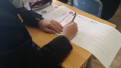 進路学習の一つとして、面接に向けての練習が始まっています。まずは、自分のことを言葉で表してみるトレーニングです。生徒たちは、「中学生活での一番の思い出は何ですか。」「あなたの長所と短所は何ですか。」「学校や学級でどんな仕事をしていましたか。」など学校生活に関する質問や自分自身に関する質問に、「え~、どう書いていいかわから~ん」「先生、○○はどう書いたらいいですか」など周りの力を借りながらも自分の言葉でつづるトレーニングをしていました。