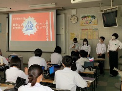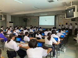 1学期の後半では、修学旅行を題材に課題解決学習および発表会をしました。修学旅行での経験から、「SDGsが話題となっているが、三重の海は大丈夫なのだろうか」「赤福はなぜこんなにも長く経営し続けてこれたのだろうか」など、班ごとにタブレット(PowerPoint)を活用して発表しました。どの班も聞く人の興味を惹くことができるような工夫を凝らし、聞いていて飽きない発表がたくさんありました。