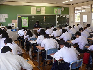 今日は、1年生はウォークラリー(地区内探検後、北勢中央公園)、2年生は職場体験学習、3年生は実力テストということで、3年生のみ学校に残り、テストを受けています。3年生は真剣にテストに向かっていました。