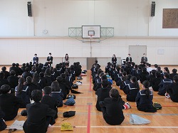 最後の授業日となった本日、令和4年度の修了式と離任式を行いました。本年度は新型コロナウイルス感染症の影響を受けながらも、臨時休校期間を設けたり、行事に関しても内容等の変更はあっても、中止や延期をしたことはありませんでした。「『今』を未来につなげられる子」の育成を目標に、学校・地域・家庭と連携しながら教育活動を進めてきました。本日の修了式において、生徒は5分前には集合し、式が始まるまでしっかりと隊形を整え静かに待つとともに、式が始まった後は、話し手をしっかりと見据え聴いていました。その真剣な姿から、生徒の成長を大いに実感することができました。離任式では8名の職員が紹介され、6名がお別れの挨拶をしましたが、そこでも(いろいろな思いを持ちながら)しっかりと話を聴く姿が印象的でした。2週間もすれば、新しい職員を紹介することになりますが、令和5年度も今のような姿で、新しい環境においてさらに成長することを期待します。