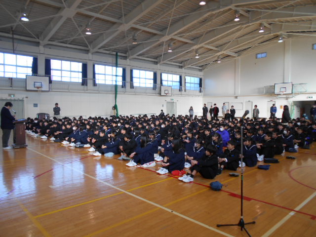 1/8(金)、3学期が始まりました。1限目は、体育館で始業式を行い、校長先生から3学期がよりよいスタートが切れるために、「当たり前の生活が、当たり前に送れること」の大切さなどが話されました。また、井上先生からは、生活面について、安全な生活を送れるよう心掛けてほしいことなどが話されました。
