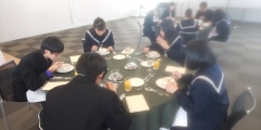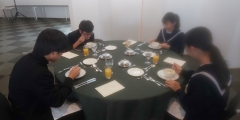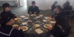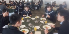 修学旅行二日目のお昼は鈴鹿サーキットでのテーブルマナー講座の中での昼食です。お皿ごとにナイフやフォークを使い、いつもと違った雰囲気で食べるコース料理はドキドキだったと思います。