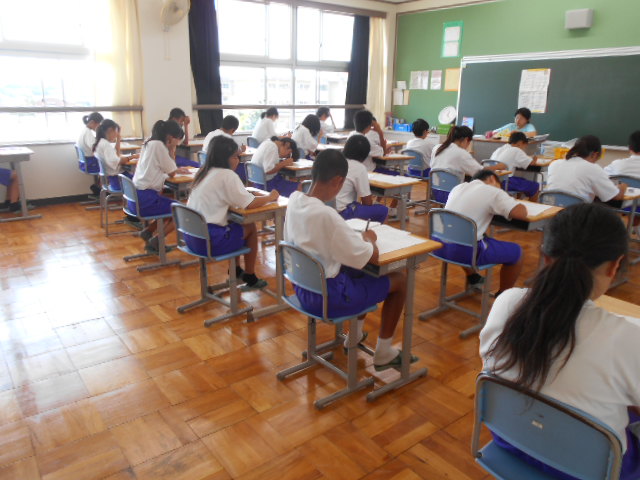 9月2日(金)、全学年とも実力テストを実施しています。新しくなった教室で初めて受けるテストでした。まだまだ暑い日々が続いていますが、頑張ってテスト問題を解いている姿が見られました。これが終わると、体育祭の取組が本格化します。気持ちも切り替えて頑張っていきましょう。