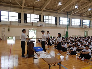 9月3日(月)、長くて暑い夏休みが終わり、本日より2学期が始まりました。1限目には2学期の始業式と表彰伝達が行われました。学校としては大きな事故等もなく、2学期が始められました。まずはそのことを喜び合い、2学期も実りのある学期にしていきたいと校長先生から話がありました。そのあと、表彰伝達を行い、中体連三泗予選等の入賞者に賞状を渡しました。