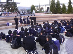 一泊二日の修学旅行を締めくくる解散式です。修学旅行実行委員会が修学旅行前からこつこつと計画をたてて代表としてみんなを引っ張って頑張っていました。一人ひとりの課題をしっかりと考え、学校生活に繋げてほしいと思います。そして二日間本当にお疲れ様でした。