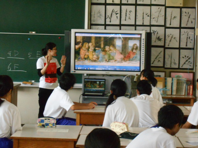 授業では、ICT機器が活躍しています。3年の数学の授業では、図形をスクリーン上に投影して図形の性質についての授業が行われ、生徒も積極的に授業に取り組んでいました。また、2年生の美術の授業では電子黒板に「最後の晩餐」を映し出して、作品を鑑賞して意見を出し合っていました。1学期も残り少ないですが、最後まで授業を頑張りましょう。