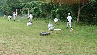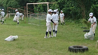 野球部では、練習試合後に草むしりやグラウンド整備をおこないました。