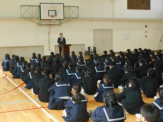 本日、学校だよりでお知らせしたとおり、7名の先生が着任され、代表して一ツ家先生からあいさつをしていただきました。その後、生徒会長より歓迎のあいさつをしてもらいました。7名の先生方、これからよろしくお願いします。
