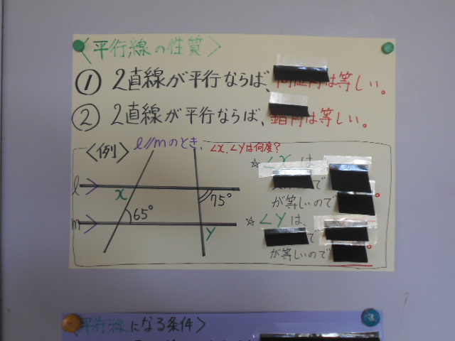 教室前廊下に数学の掲示物がはられていました。図形の角度についてのポイントがまとめられていて、確認ができるようになっています。このような工夫を生徒の皆さんもやってみてはどうでしょうか。たとえば、社会の歴史年表のポイントをまとめて、自分の部屋にはっておくとか。ちなみに教頭先生の食卓の横の壁には世界地図をはっています。よく国名当てクイズや首都名あてクイズをやりましたよ。