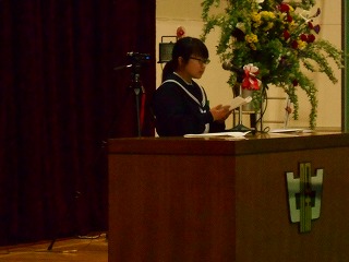 式歌は「旅立ちの日に」を全校生徒で合唱しました。そのあと、卒業生の感謝の歌として「あなたへ -旅立ちによせるメッセージー」を合唱してくれました。