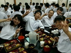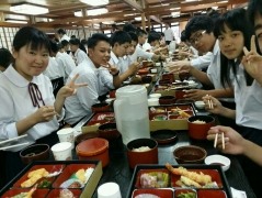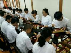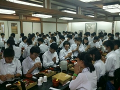 夜の劇団四季鑑賞の都合で、少し早い夕食です。雷5656(ゴロゴロ)会館で、写真のような夕食をいただいています。みんなでワイワイしながら食事を楽しんでます。