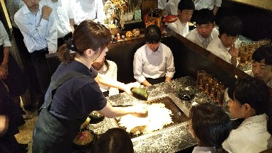 最初にお店の人にもんじゃ焼きの作り方を教えてもらってから、各テーブルでもんじゃ焼きスタートです!A組の様子です!