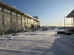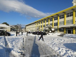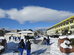 本日は、昨日の降雪による積雪のため、余裕をもって登校できるよう始業時間を1時間遅らせました。生徒の皆さんは、雪の残る通学路を安全に留意しながら登校しました。朝からの職員による雪かき、日中の陽光によって、雪の量も随分減りました。