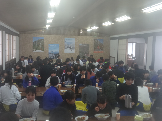 午前中、基本的な事を教えてもらった後に、斜面を上ってボーゲンの形で滑る練習を始めました。「楽しい!!」「キャー!!」って叫んでいる子もたくさんいます。 さすが中学生、みんな上達が早いです。