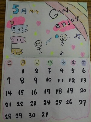 5月の掲示板は2年生、カレンダーは3年生の谷口真緒さんが作ってくれました。