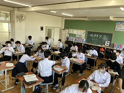 5限目に修学旅行事前学習として、ハンセン病についての学習をしました。正しく知らないことで起きる差別・偏見が今もあるということを、この学習を通じて自分に振り返ることができたらと思っています。生徒の中には、新型コロナウイルスが出始めたころの周りの人々や自分自身の差別心に重ねて、意見を出している人もいました。修学旅行で訪れる国立ハンセン病資料館にて、差別の実態や差別をなくそうと立ち上がった姿から学んできてほしいと思います。