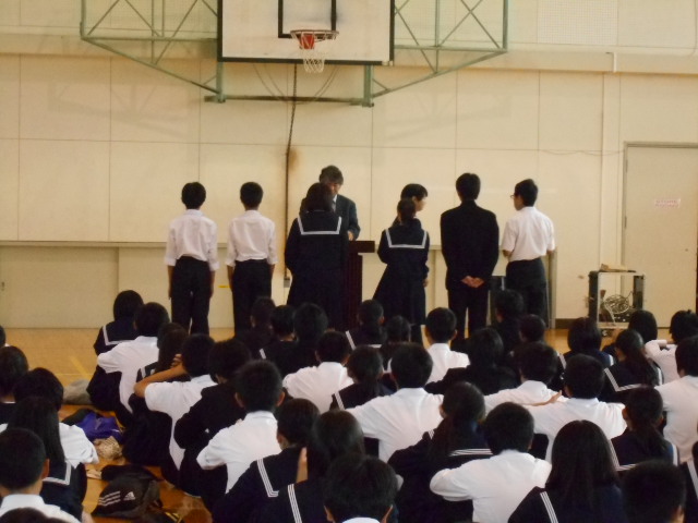 10月9日(金)6限目に、体育館で認証式を行いました。生徒会役員選挙や学級での話し合いで、後期の新しい体制が決められました。一人一人が呼名の後、大きな返事をして決意を新たにしていました。自分の責任を最後まで果たしていくことを、一人一人が意識していきましょう。また、それを支える周囲の人も協力することが大切ですので、役員さんと同じ気持ちで後期の中学校生活を送っていきましょう。