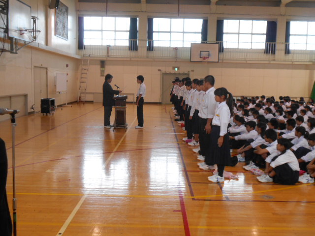 10月11日(火)、6限目に後期生徒会役員・学級役員・専門委員の認証式を行いました。整列するのに少し時間がかかりましたが、呼名の後の返事も大きな声でできており、やる気を感じることができました。生徒会役員は1年間、学級役員・専門委員のい人は半年間、責任をもって自分の役割を果たしていきましょう。11月には文化祭があります。まずは文化祭が成功するよう協力していきましょう。