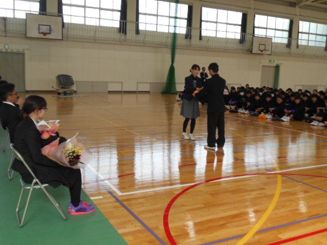 修了式の後、今年度で本校を離任または退職される先生方の離任式を行いました。先生方お一人ずつから、お別れの言葉をしていただきました。その後、先生お一人ずつに生徒からメッセージと花束を贈呈しました。最後に、全員合唱で先生方を送りました。新任地でのご活躍をお祈りしています。