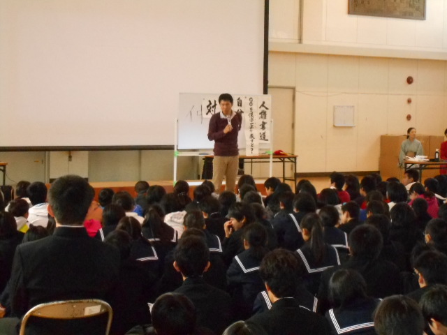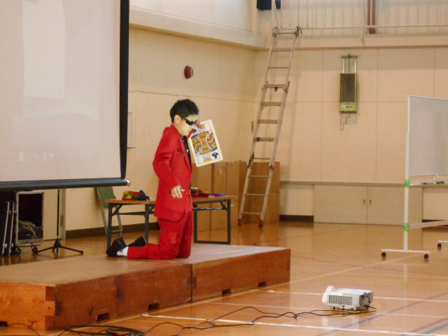 2・3限は体育館において、小中PTA合同の教育講演会を徳島県人権エンタメ集団「友輝」の中倉茂樹さん、森裕生さん、阿部千秋さんを講師にお招きして、人権について3人それぞれの切り口でお話しいただきました。森さんは、脳性マヒの障がいのあるプロマジシャンで、楽しいマジックを見せていただきました。そのあと、障がいについての自分の思いをみなに語りかけていただきました。阿部さんは、書道の師範であり、今回は人権書道ということで、「自分」・「家族」を漢字一文字で表すことで、一人一人の思いに触れていただきました。前のホワイトボードに出ていただいた小中生・教師・保護者の方、ありがとうございました。そのあと、ご自身の体験を話していただき、親の差別心と向き合い、少しずつ変わっていったことを語られました。中倉さんからは、被差別部落出身でご自身の結婚の際に受けた差別について語っていただきました。多くの仲間に支えられながら、自分たちの子どもに会わせることをきっかけにしながら、差別で固まってしまっている相手の心を溶かしていった体験を語っていただきました。その人そのものを見ずに、偏見に凝り固まった心で接することがいかに多くのものを失っていくかをあらためて教えていただきました。