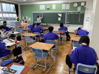 間隔をあけて席に座り、感染予防に気をつけながらの授業でした。